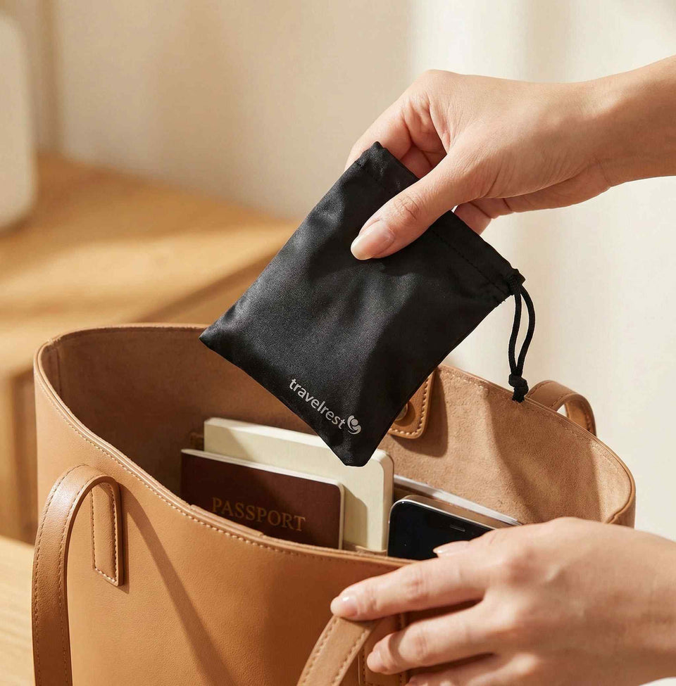 Weighs practically nothing. Folds easily into a 4" x 6" satin pouch with included earplugs.